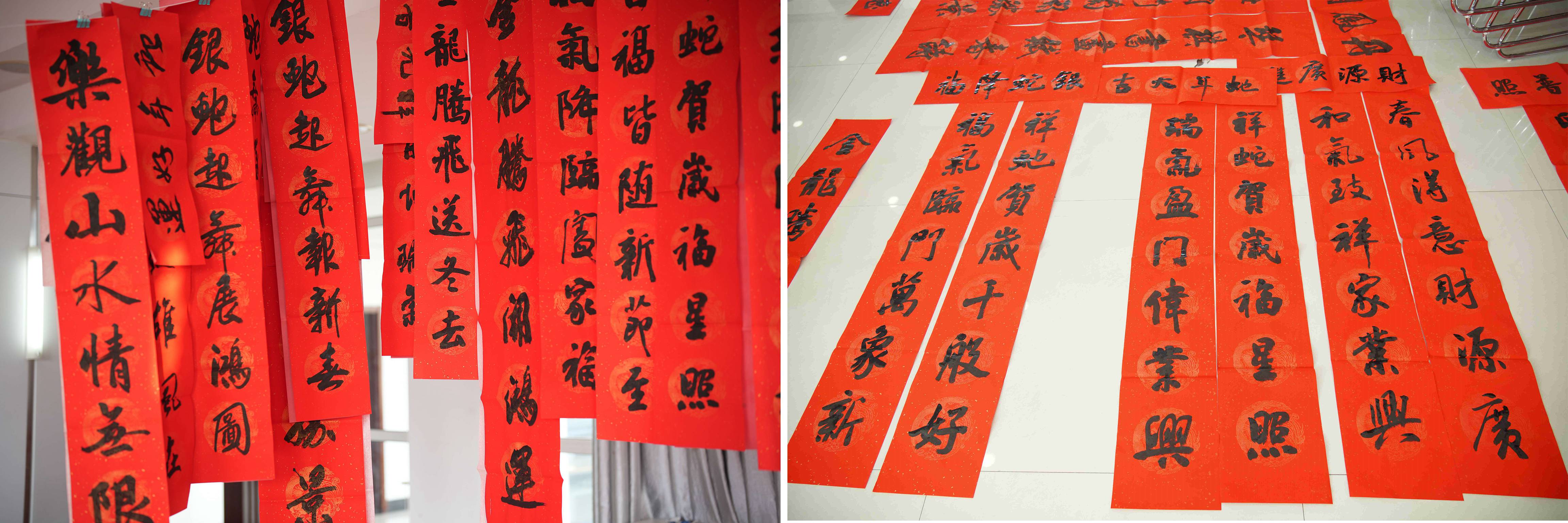 隨后,各位書法老師現(xiàn)場(chǎng)揮毫潑墨,書寫新春祝福。一張張紅彤彤的春聯(lián)象征著喜慶吉祥,傳遞著“喜迎新春,諸事和順”的美好愿望。