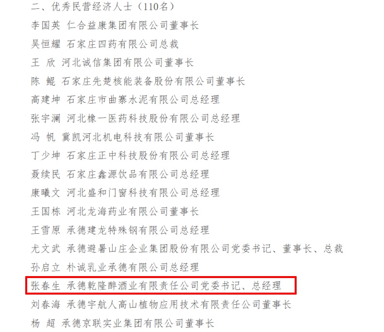 近日,河北省人民政府印發(fā)《關(guān)于表彰2024年度河北省優(yōu)秀民營企業(yè)、優(yōu)秀民營經(jīng)濟(jì)人士的通報(bào)》(冀政字〔2025〕14號),板城酒業(yè)黨委書記、總經(jīng)理張春生憑借卓越的領(lǐng)導(dǎo)力和對區(qū)域經(jīng)濟(jì)發(fā)展的突出貢獻(xiàn),獲評“2024年度河北省優(yōu)秀民營經(jīng)濟(jì)人士”稱號。