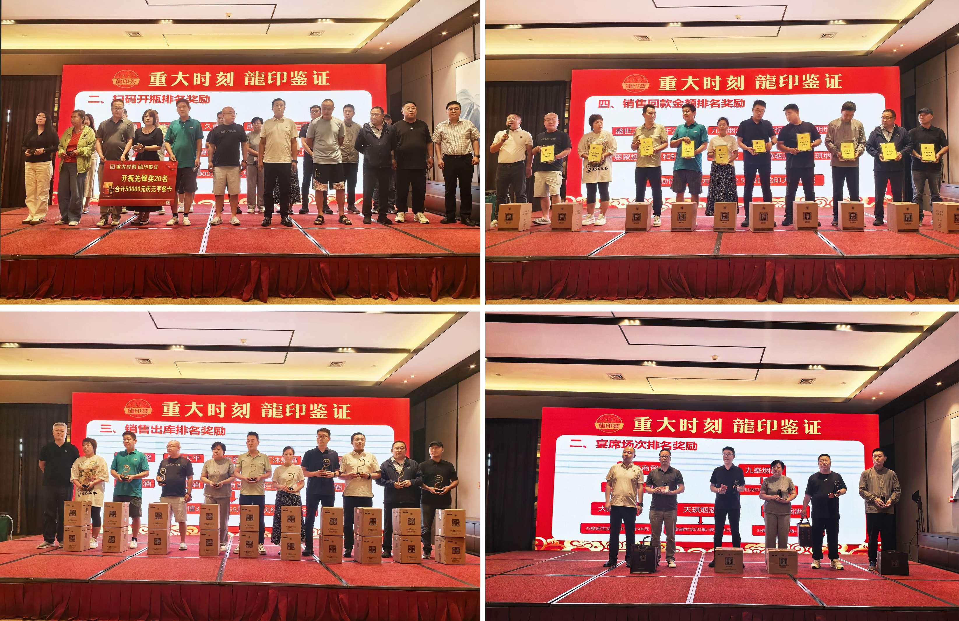 為感謝經(jīng)銷商伙伴長久以來的支持和貢獻(xiàn),活動現(xiàn)場還設(shè)置了頒發(fā)環(huán)節(jié),石家莊戰(zhàn)區(qū)龍印部銷售總監(jiān)孫坤申、恒潤德酒類品牌管理有限公司董事長潘雁群、石家莊戰(zhàn)區(qū)龍印部區(qū)域經(jīng)理徐立國、恒潤德酒類品牌管理有限公司龍印事業(yè)部經(jīng)理張原分別為開瓶率、履約、回款、宴席做出突出貢獻(xiàn)的終端客戶進(jìn)行頒獎。